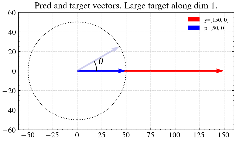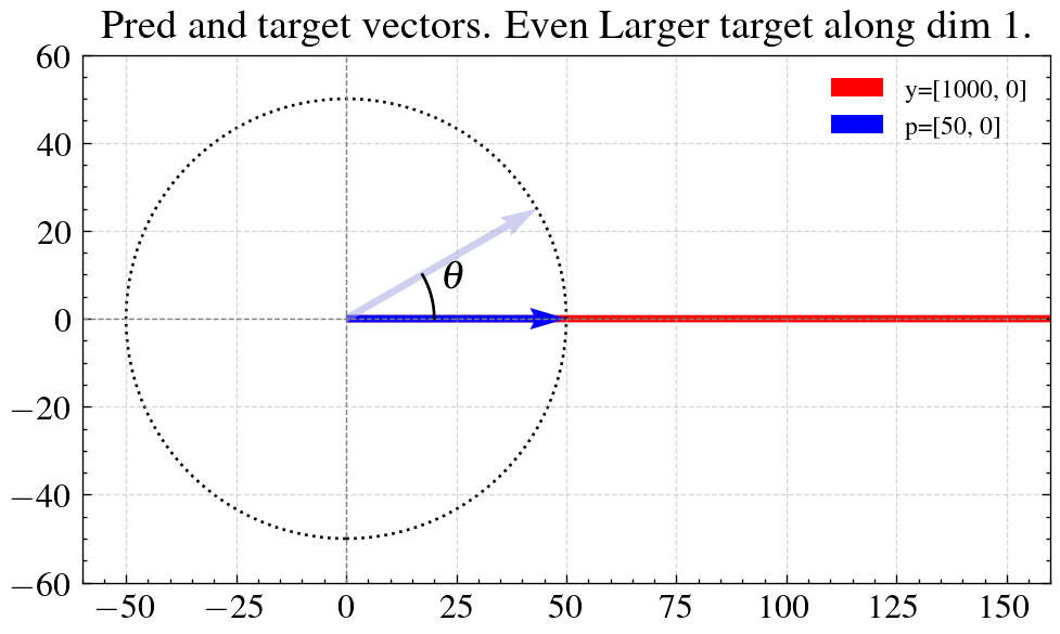 If there is an error component much larger than the others, say it is \(e_1\), it's also worth inspecting one of the small components, say \( e_2 \). Whereas \( \dv{\mathcal{L}}{e_1} \) was scaled down to \( \pm 1 \) by the magnitude of \( e_1 \), \( \dv{\mathcal{L}}{e_2} \) will also be scaled down, but to potentially a very small value due to the scaling effect of \( e_1 \). This highlights a major difference between a L2-norm based loss and MSE: the component-wise gradients are dependent when using L2, and are independent when using MSE.