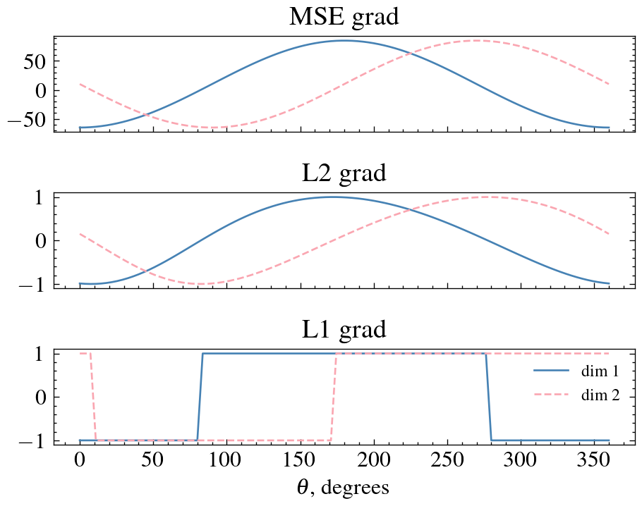 How does MSE, L2 and L1 gradients wrt. the two elements vary as theta is varied? In other words, how does \( \dv{\mathcal{L}}{p_1} \) and \( \dv{\mathcal{L}}{p_2} \) vary with theta?