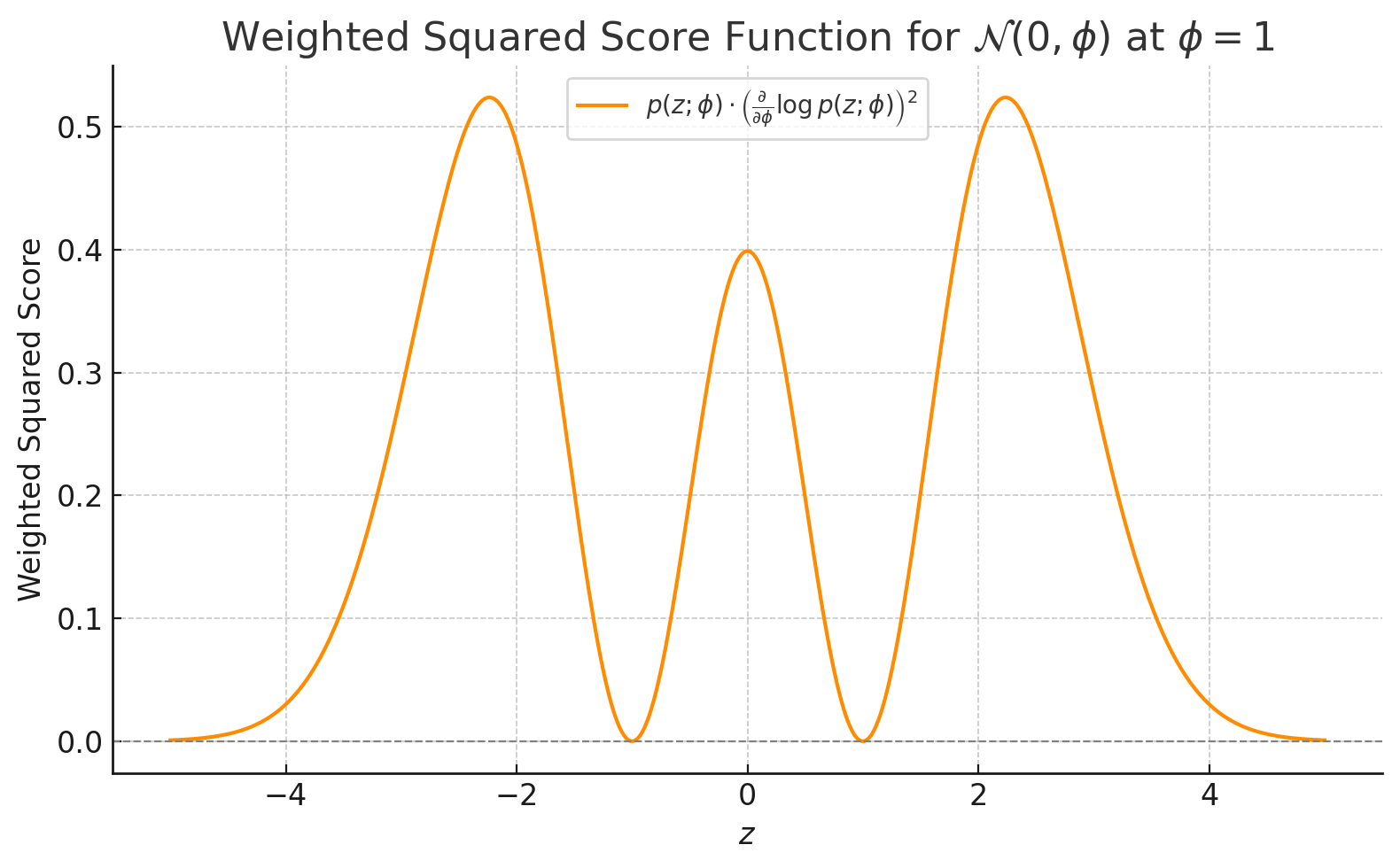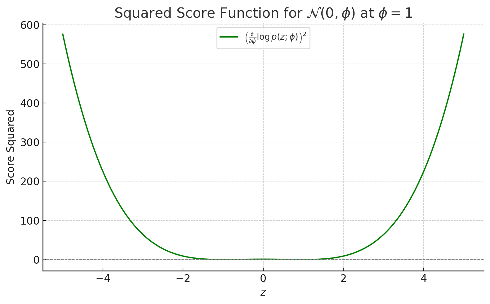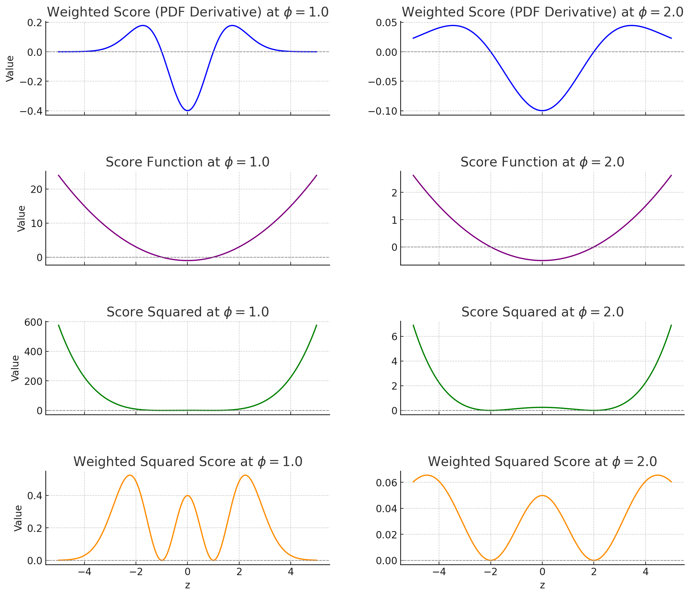For example, given an observation \( z=-4 \), a \( \mathcal{N}(0, \phi=1) \) distribution would increase the assigned likelihood quite dramatically by increasing \( \phi \). This can be seen by looking at the score function. The squared score function is only really interesting here as it integrates to something non-zero, so it's interesting in aggregate, but doesn't say anything more about a particular \( z \) compared to the score function. Although \( z = -4 \) would have a dramatic effect, before observing the \( z = -4 \) value, we actually don't think such an observation is very likely, so it's contribution to the weighted score (or weighted score squared) is still small.