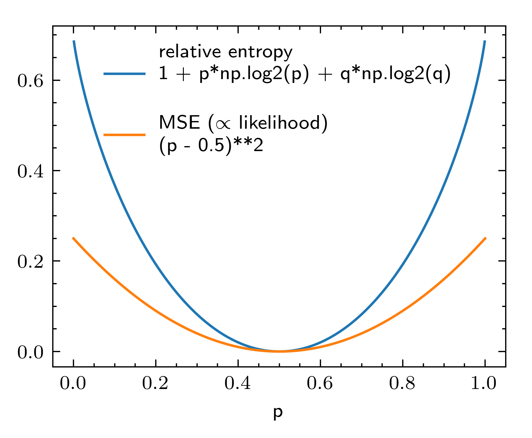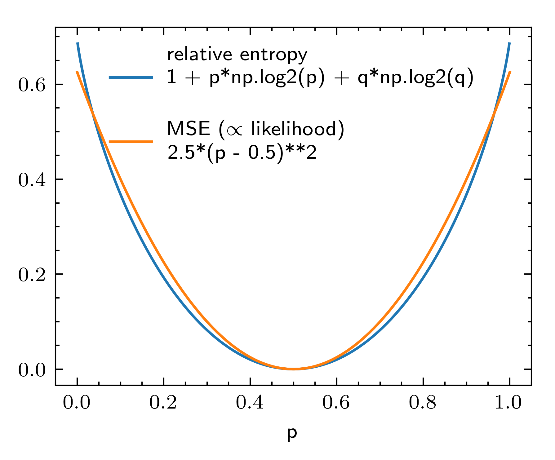 When the videos or images are normalized to the range [0, 255], this difference is less pronounced. Below is the MSE scaled to roughly match the relative entropy curve. You can see that they are not scaled versions of each other: