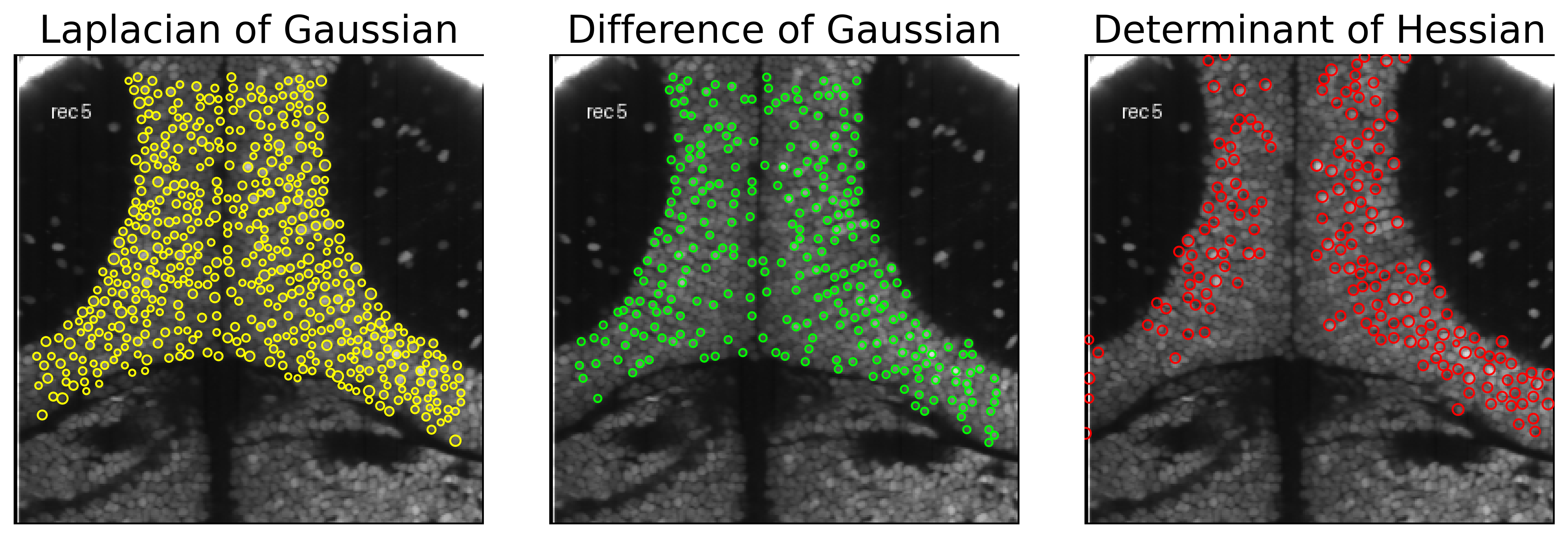 Continuing the DIY approach, next is to use blob detection for detecting cell bodies. scikit-image has a few blob detection algorithms; following the example from the docs we apply three different blob detection algorithms to the mean stack from recording 5. While we are at it, we filter in by a painted mask so to select the area we are interested in.masked = brush_mask(in_img)