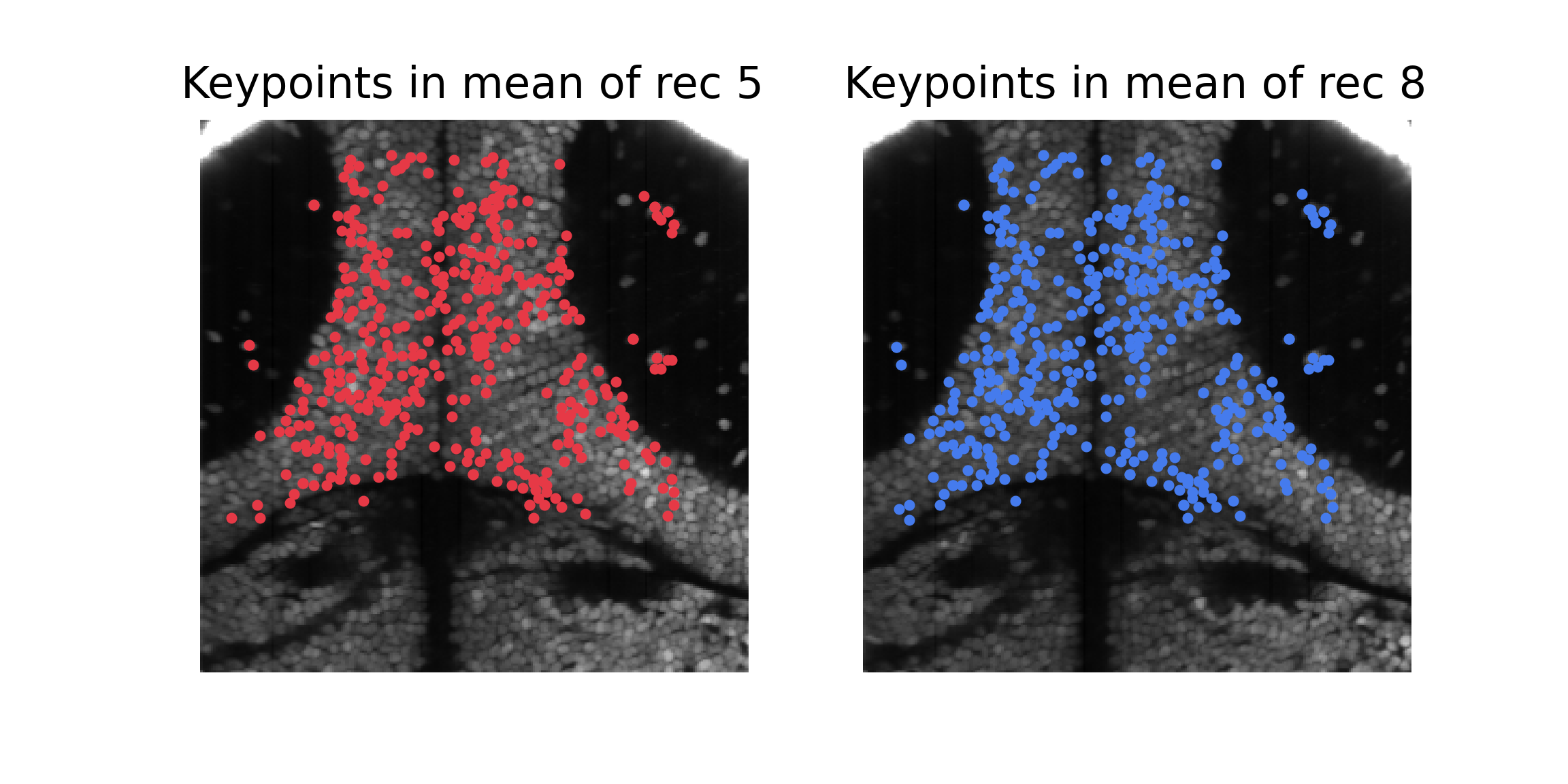I had a go at using Caiman, Suite2P and jnormcorre for frame registration (alignment). All three of them were a bit frustrating to use, and I struggled to get them to align across multiple recordings. In the end, I found much more success using keypoint detection and matching.